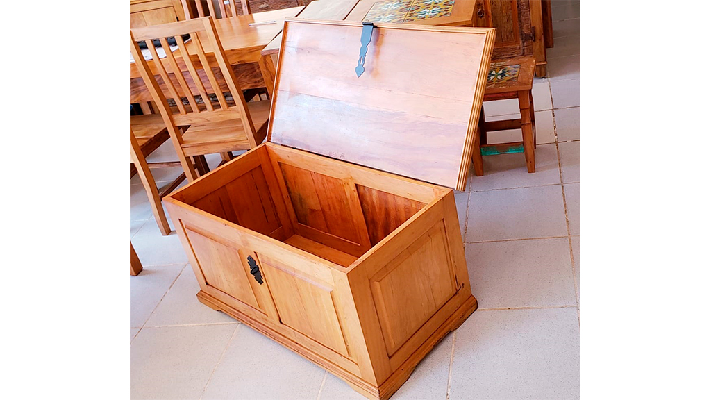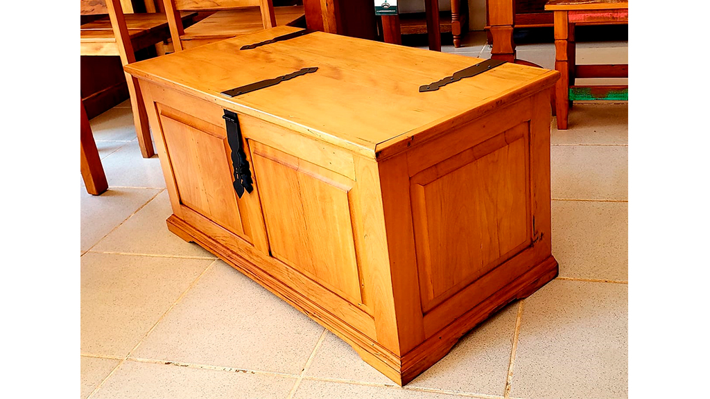 Baú muito sofisticado, com ferragens em cor preta, totalmente em peroba rosa – medidas sob encomenda